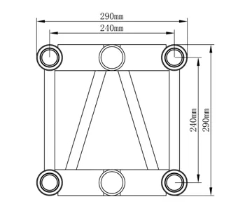 DT36 方形桁架采用高强度 EN-AW 6082 T6 铝合金制成,配备 50×2 毫米主管和 16×2 毫米支撑。其外部尺寸为 290 毫米,支持各种应用,包括舞台索具、展览搭建和活动基础设施。其模块化设计允许灵活配置,非常适合室内外使用。每个部分都包含连接硬件,方便组装。
