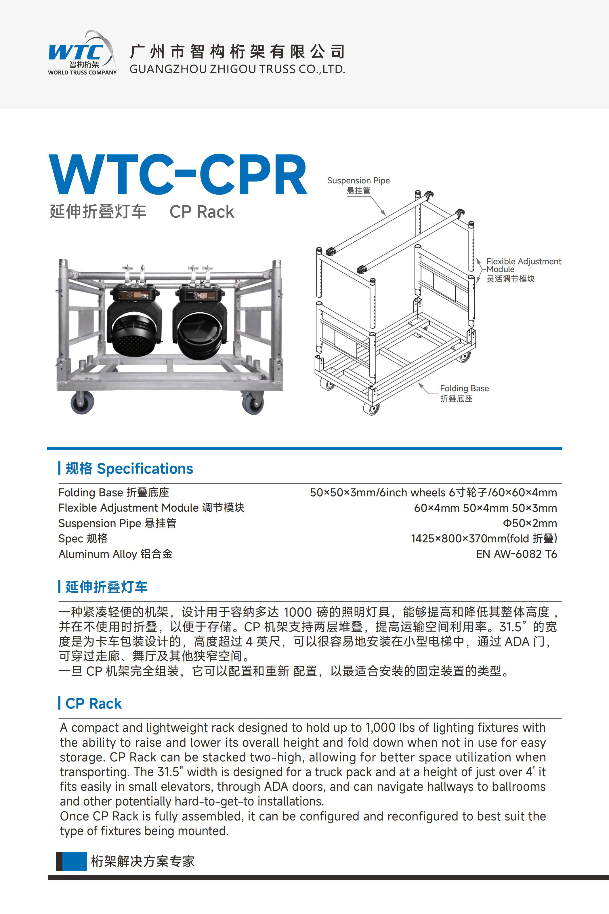 延伸折叠灯车,一种紧凑轻便的机架,设计用于容纳多达 1000 磅的照明灯具,能够提高和降低其整体高度 ,并在不使用时折叠,以便于存储。CP 机架支持两层堆叠,提高运输空间利用率。31.5” 的宽度是为卡车包装设计的,高度超过 4 英尺,可以很容易地安装在小型电梯中,通过 ADA 门,可穿过走廊、舞厅及其他狭窄空间。一旦 CP 机架完全组装,它可以配置和重新 配置,以最适合安装的固定装置的类型。