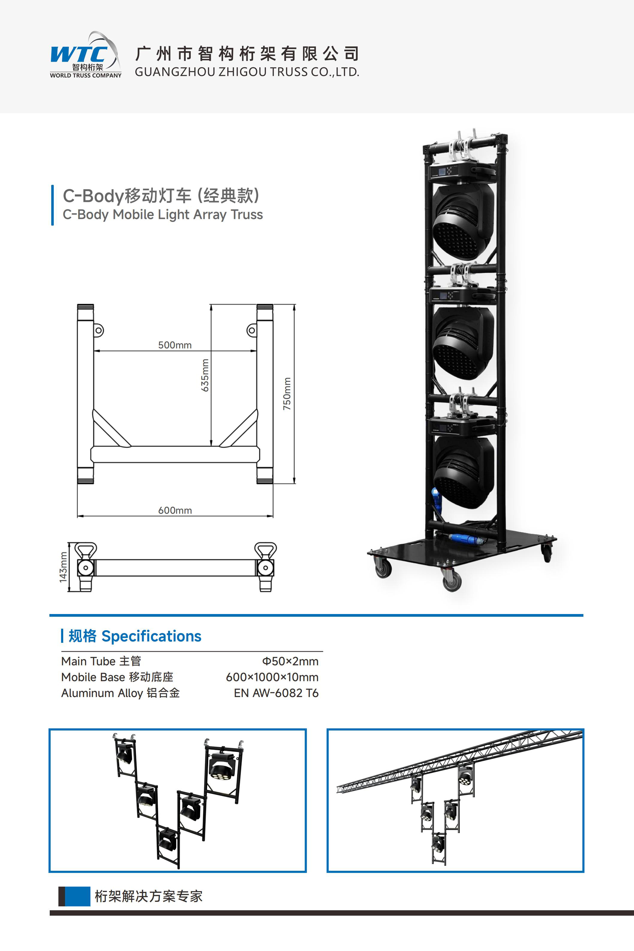 C-Body 移动灯阵桁架是一种多功能、模块化的灯光支撑系统,由高强度铝合金 EN AW-6082 T6 构成,确保耐用性和轻量化性能。这些框架通常尺寸为 600毫米(宽)x 760毫米(高),并设计用于使用锥形连接器快速组装。它们非常适合在各种活动环境(包括音乐会、展览和节日)中创建动态灯光设置。该系统可以灵活配置,能够在较小占地面积内悬挂多个灯光设备。