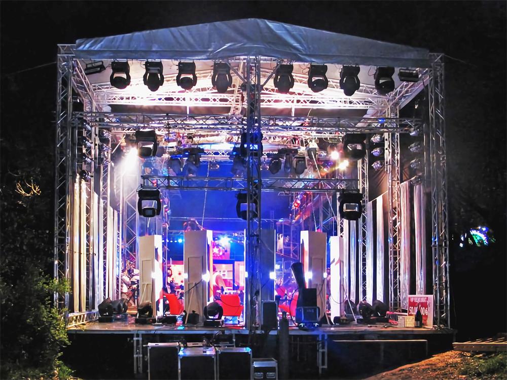 现场节目录制棚内搭建采用的是插销式铝合金桁架,其安装简易且具有良好的延展性。顶部搭配双料涂层的PVC篷布,一定程度上起到防风和遮光的效果。