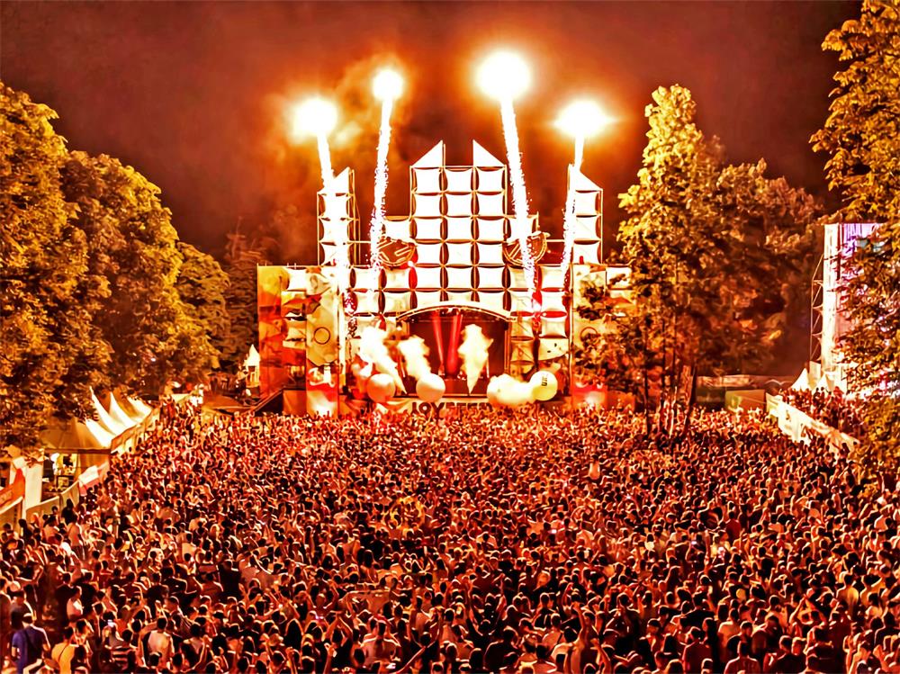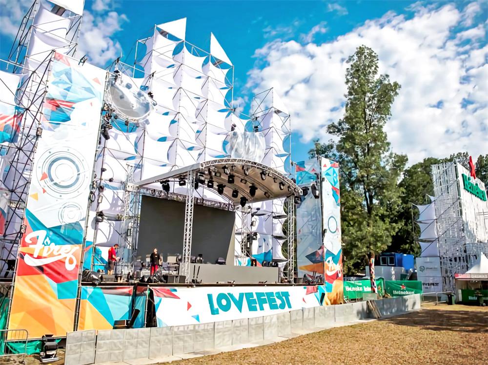 此次选取的户外区域较大,除了舞台区外还有可容纳数千人的观众席。搭建的舞台其顶部采用了弧形桁架和灰绿色的篷布,四周采用直架,通过插销的方式将它们组装起来。另外,舞台两侧有大型的直架作为背景,正面张贴设计海报。这样的设计方案特别适合于大型户外音乐节演出,在安装和拆卸方面尤为便捷。