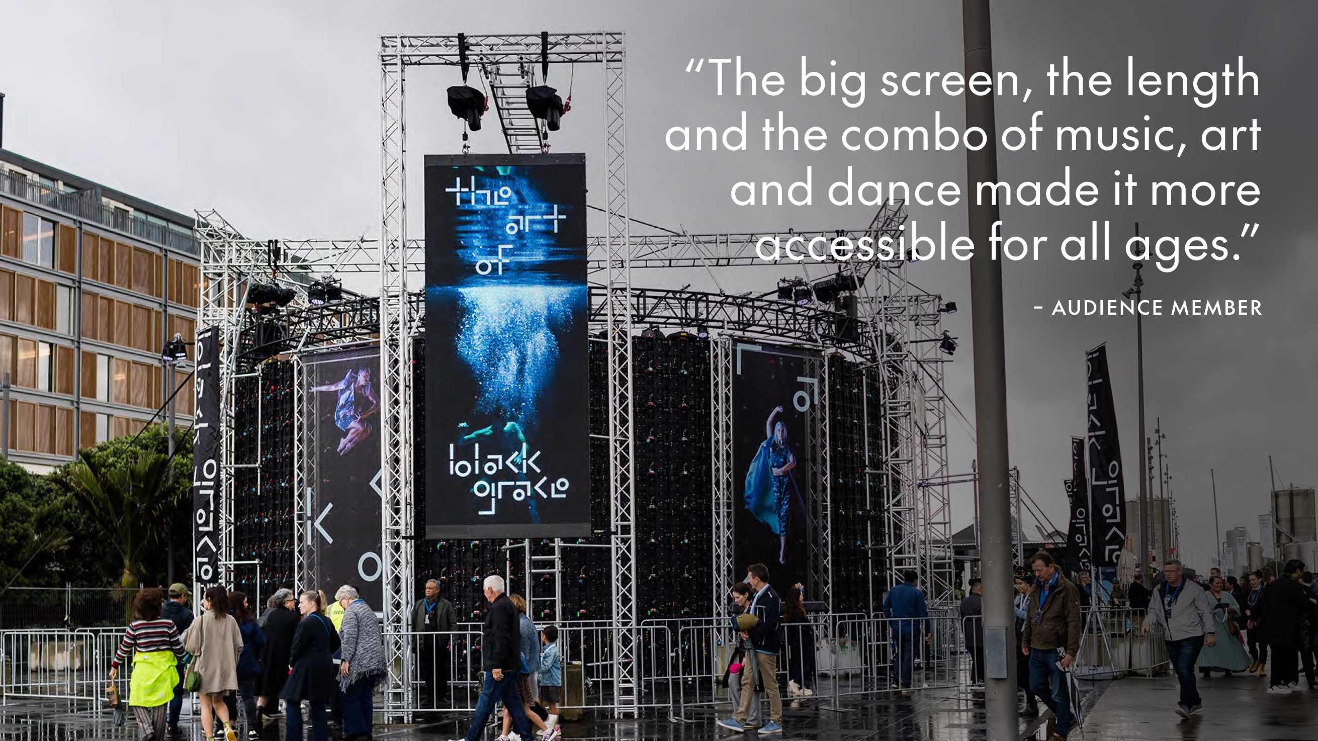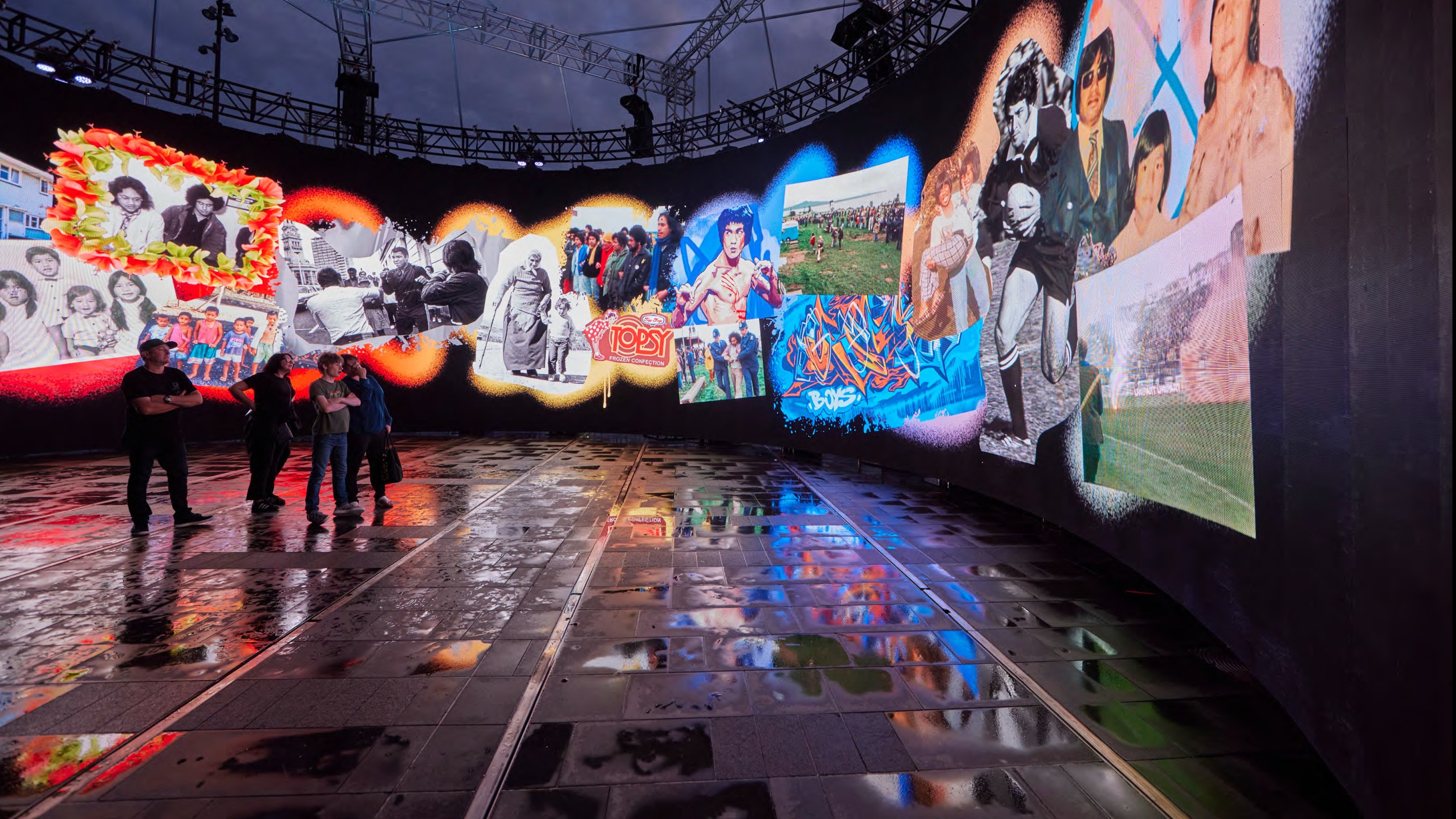 这是一个完全可移动的模块化项目。它可以按比例放大或缩小,以适应室内外的场地。该体验设计造型为 360 度环绕的圆柱形结构,整体高达 6 米,直径15米,配有 288 平方米的 LED 面板。超大银幕以及音乐、艺术和舞蹈的结合使其更适合所有年龄层的观众。