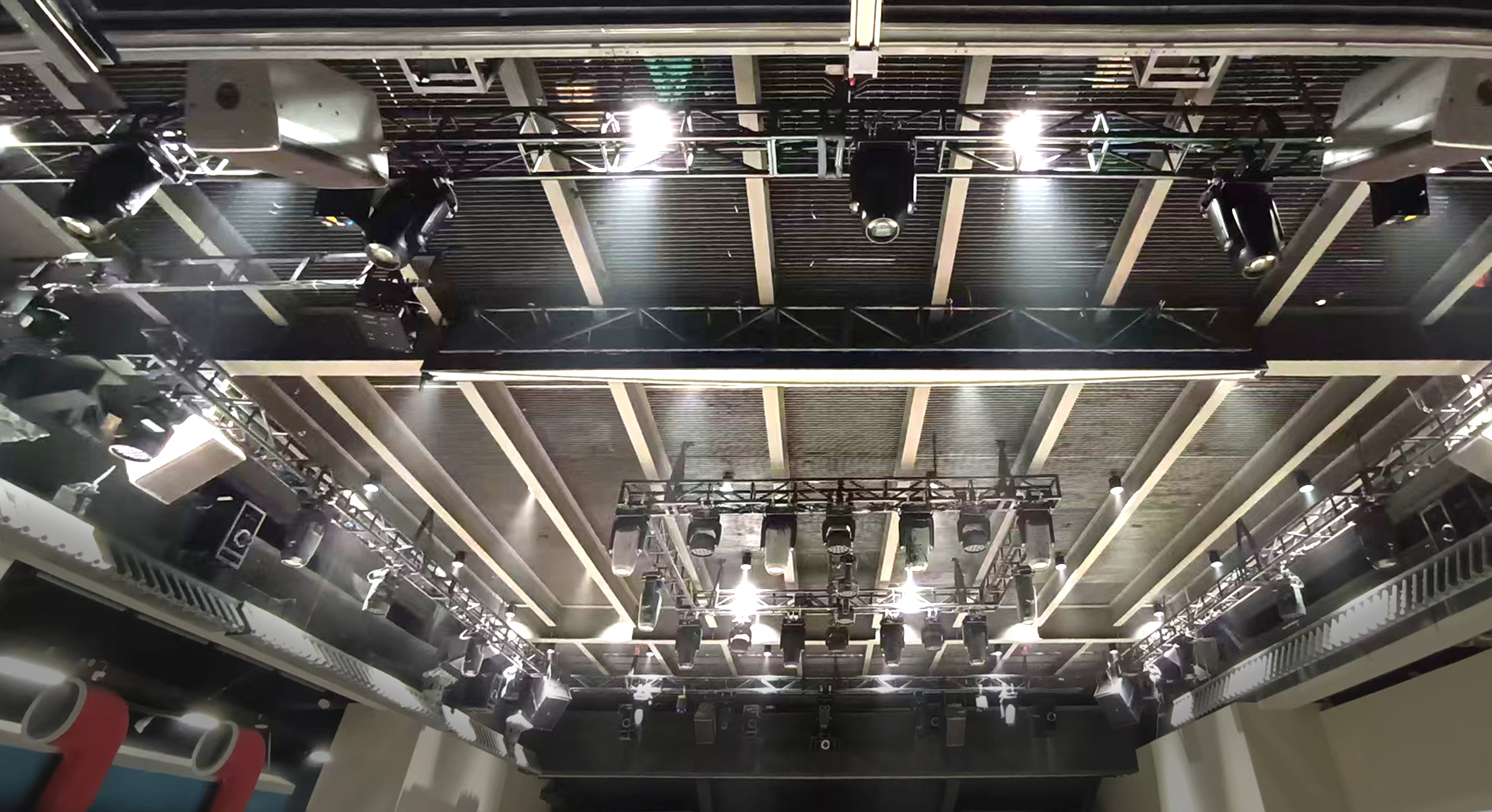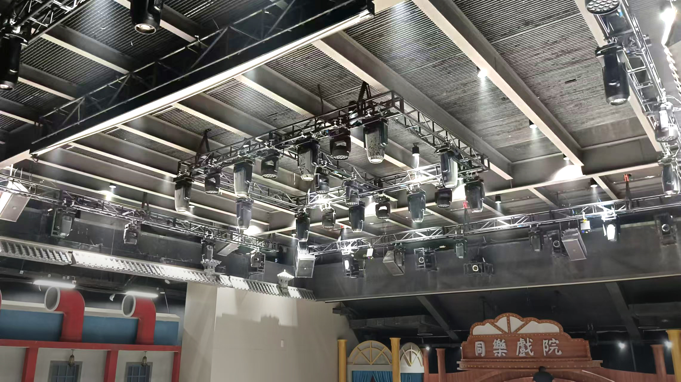 同乐戏院,位于山东省威海市,是首个360沉浸式数字体验戏剧场。作品《栖霞街》在此隆重上演,剧中通过虚拟影像与真人表演,打造出时空交错的场景,为观众带来多层次的视听体验。表演中悬挂灯具采用的是我司的方通螺丝架,规格为(300×300)mm,主管(50×3)mm,副管和斜管均为(25×5)mm,总长67米,定制黑色表面喷涂。