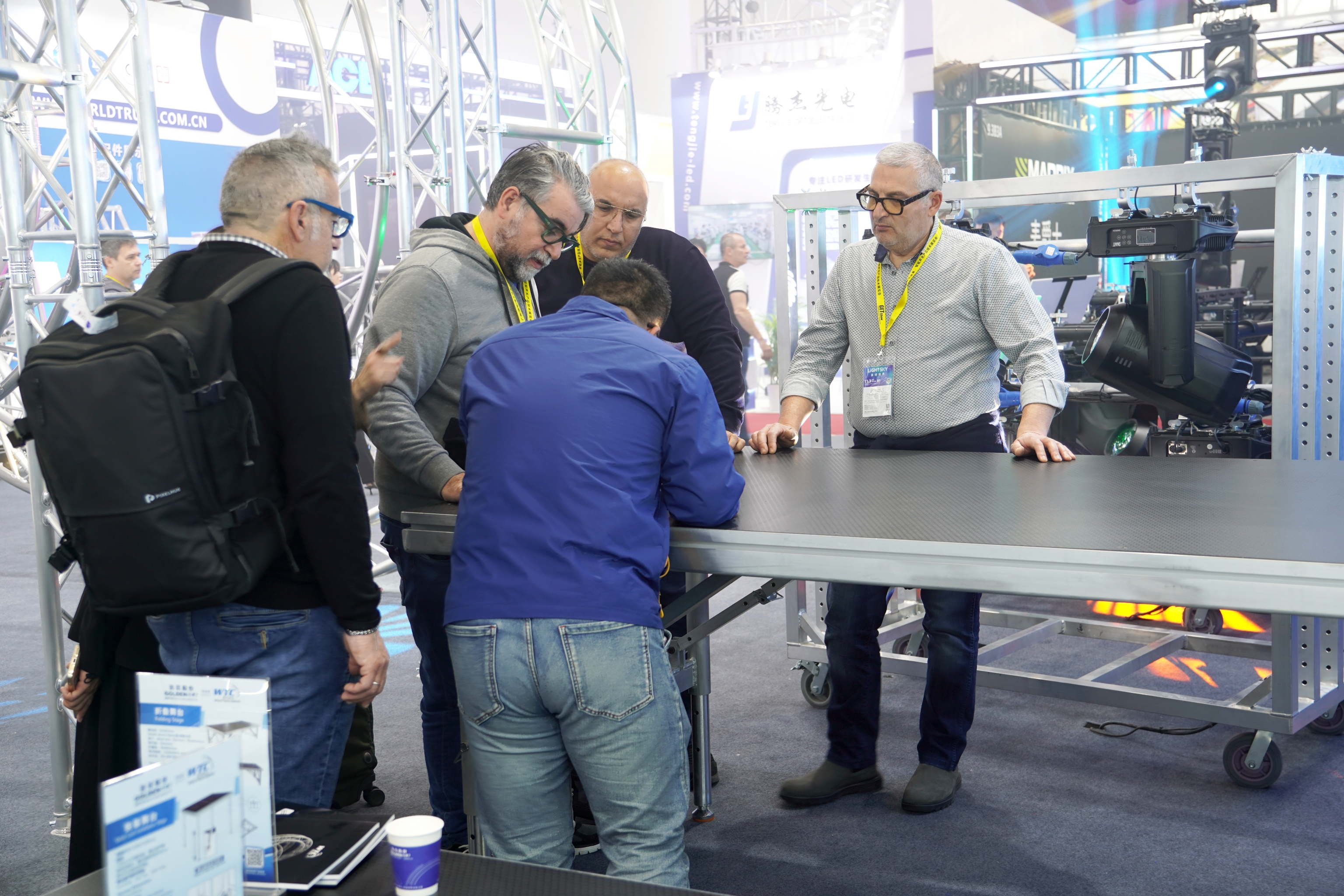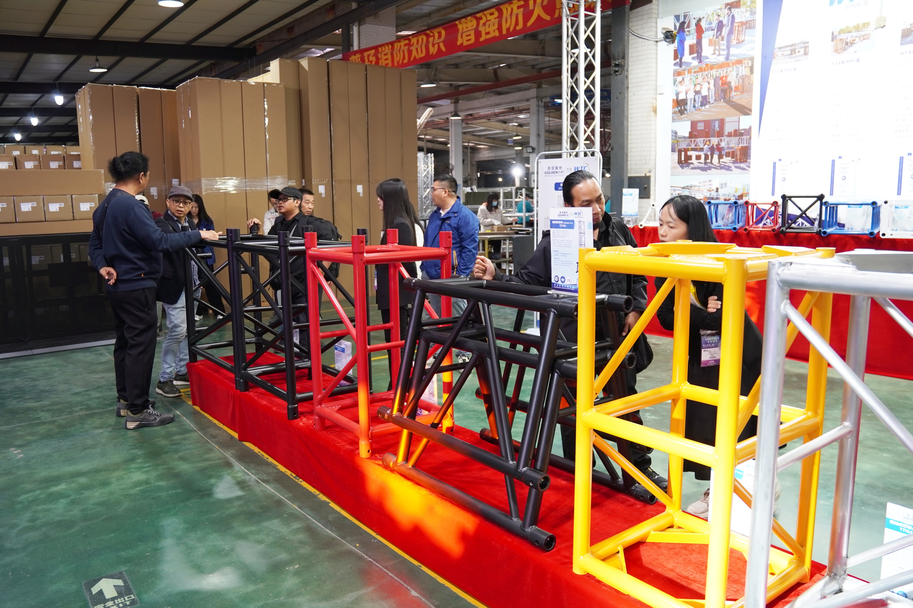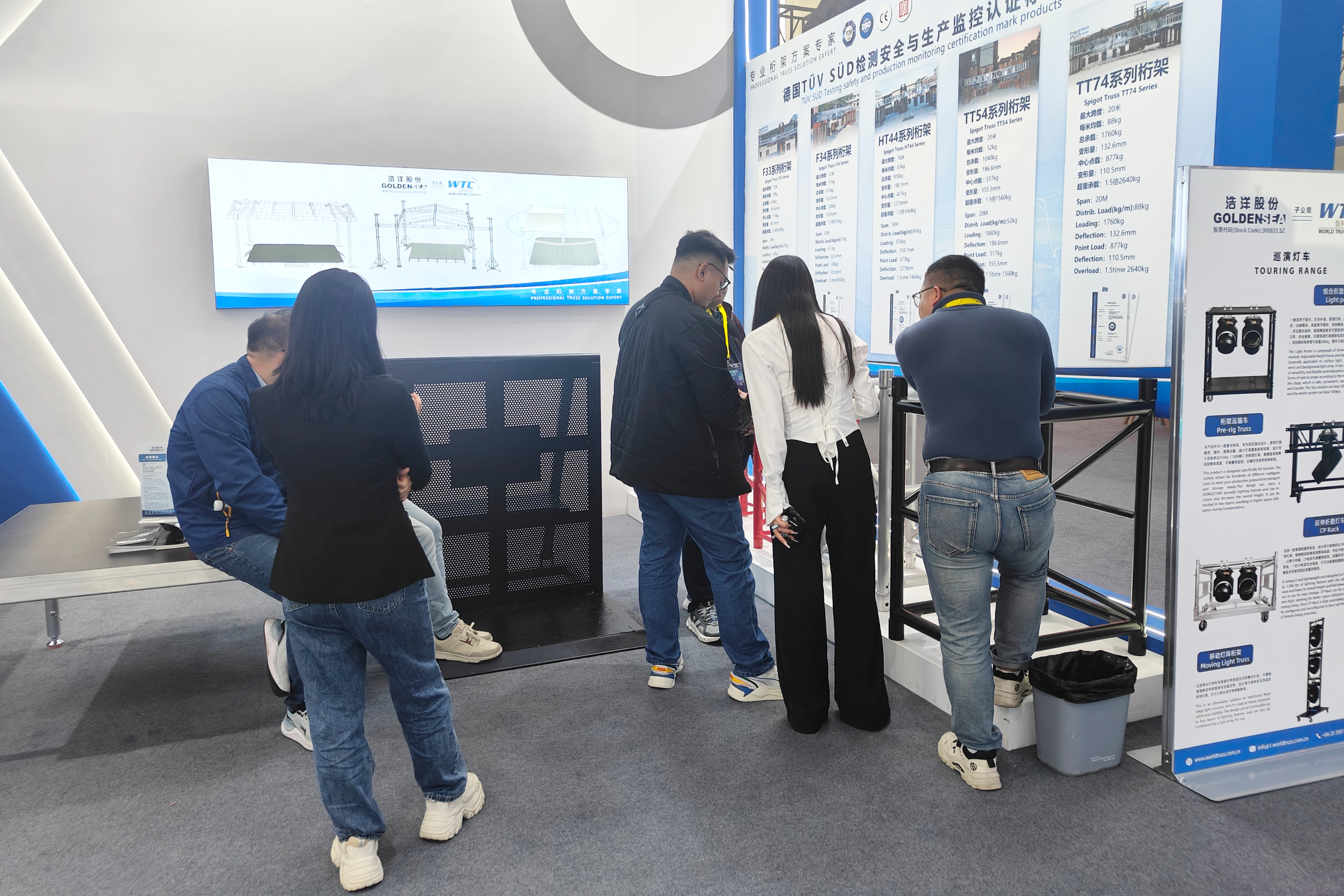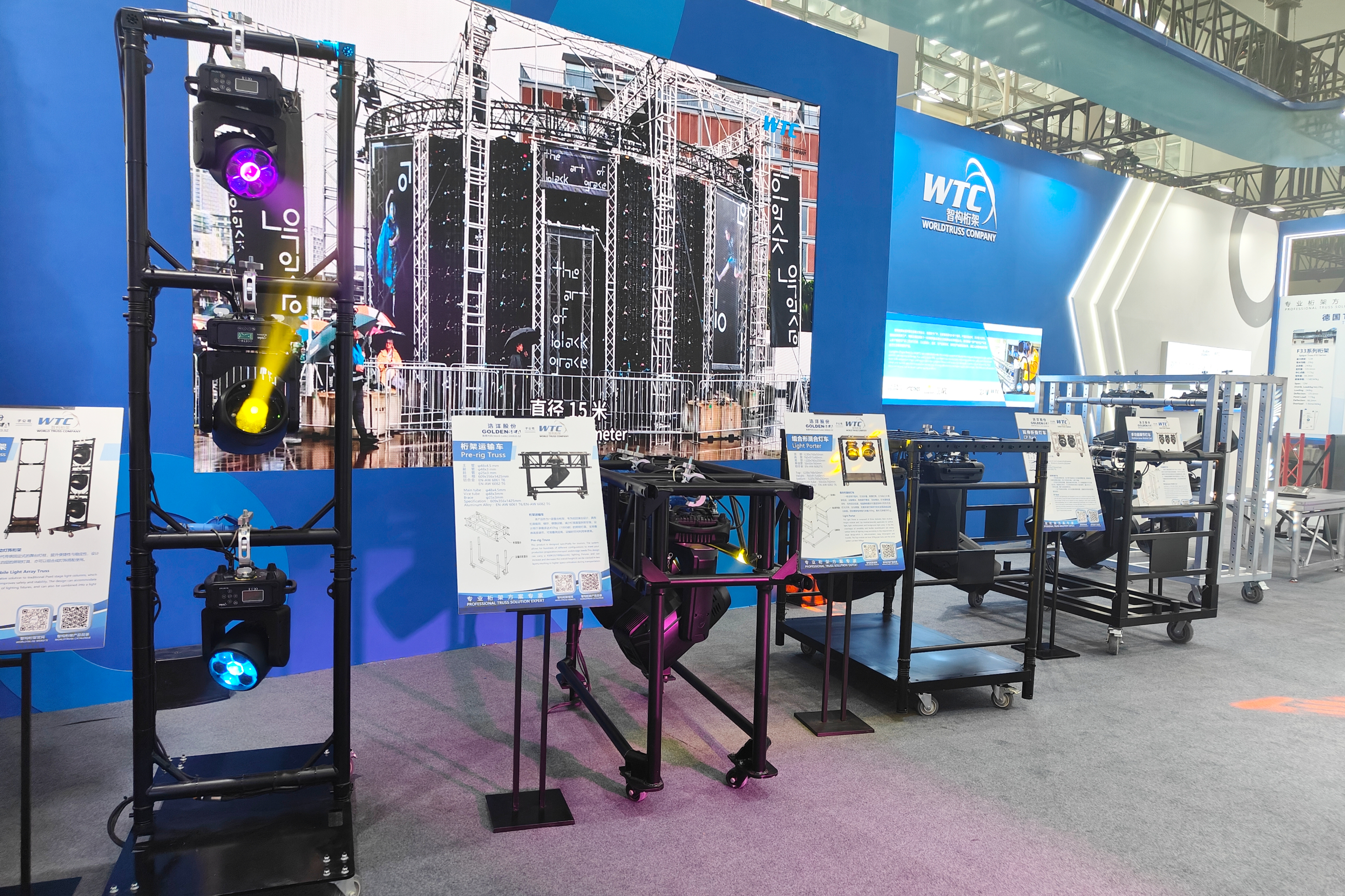 此次展会上,客户对我司的六款明星灯车格外感兴趣,每款灯车都有不同的亮点,如方便拆卸运输、结实稳固、功能多样等。此外,还有折叠舞台、环形灯架、桁架系统等也十分抢眼。