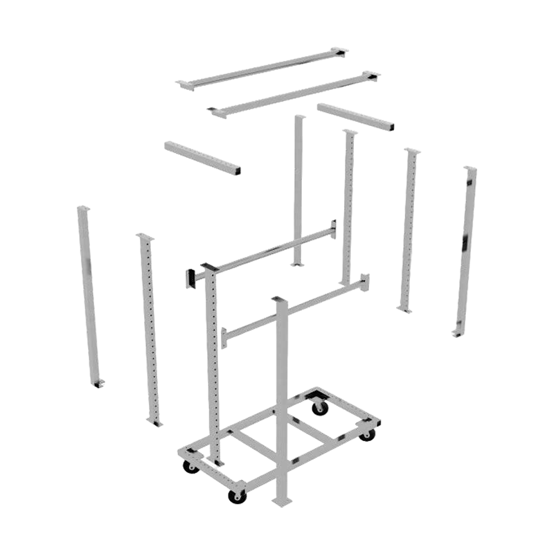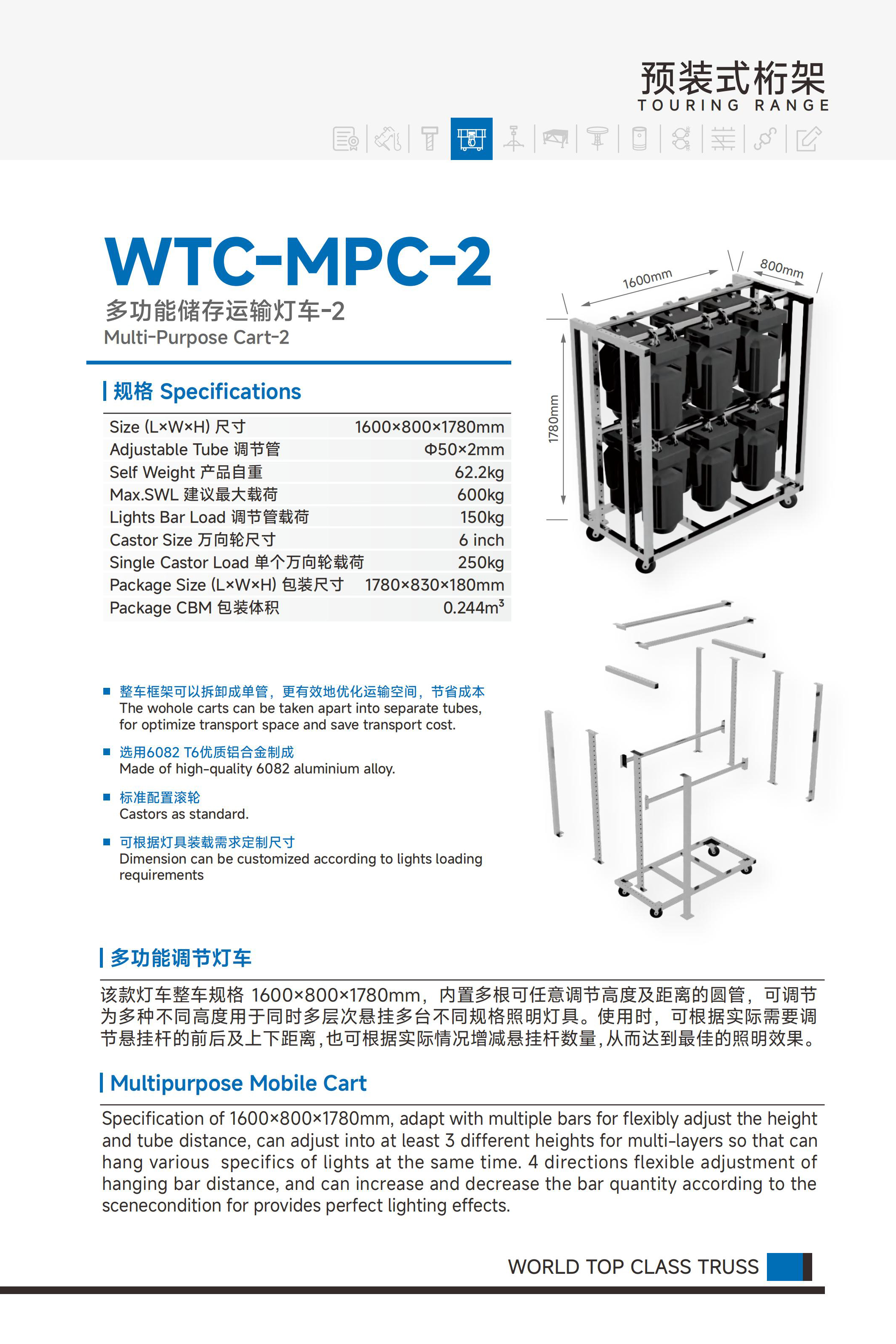 该款灯车整车规格 1600×800×1780mm,悬挂管可拆卸调节位置,整体框架可拆卸为单管。内置多根可任意调节高度及距离的圆管,可调节为多种不同高度用于同时多层次悬挂多台不同规格照明灯具。使用时,可根据实际需要调节悬挂杆的前后及上下距离,也可根据实际情况增减悬挂杆数量,从而达到最佳的照明效果。