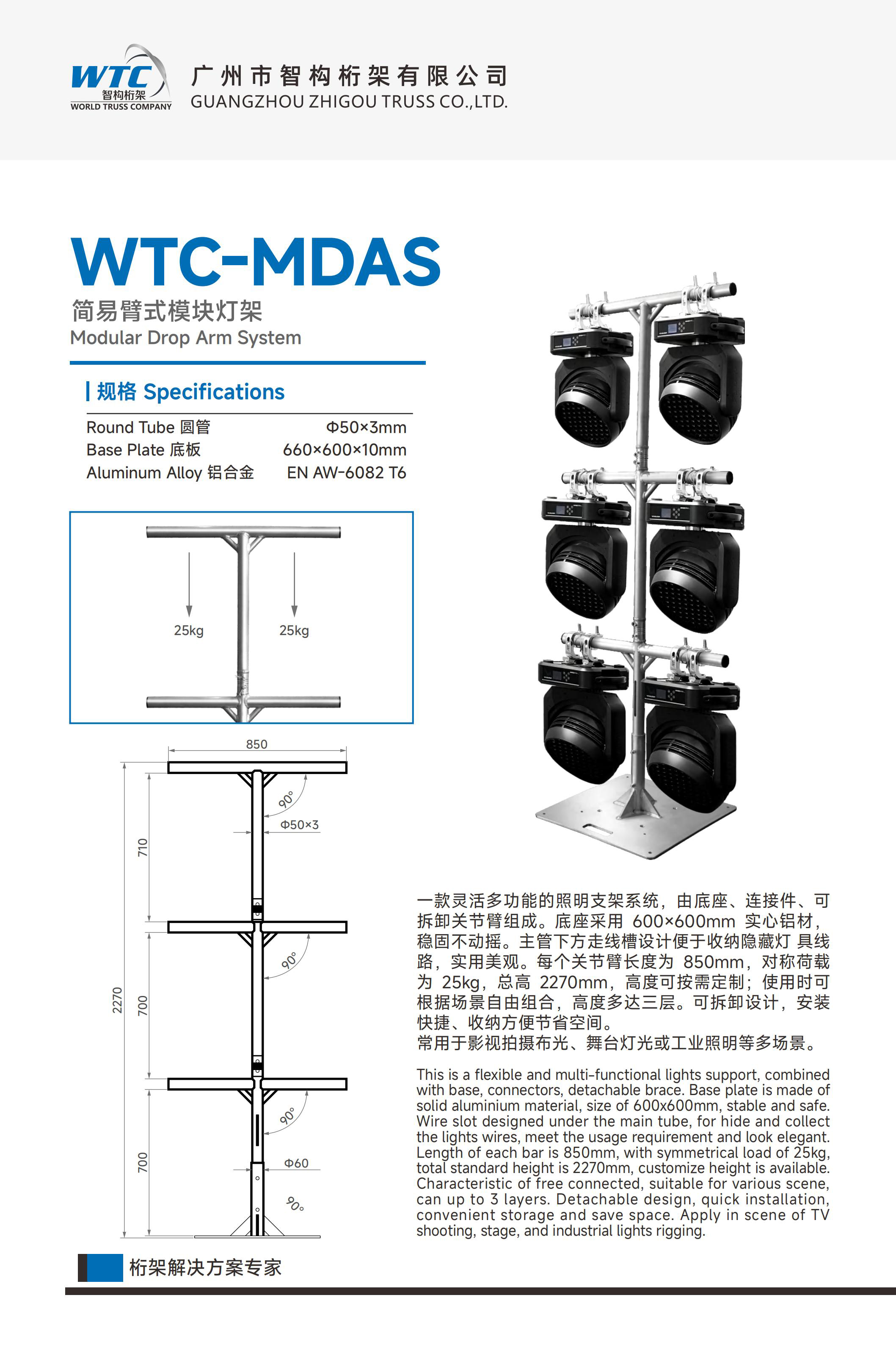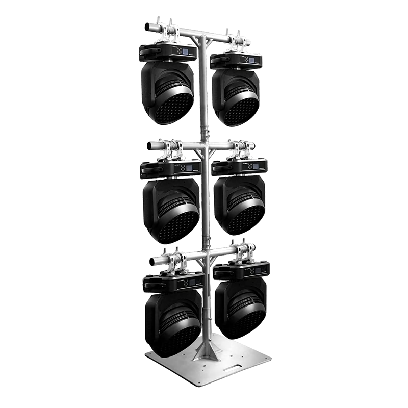 一款灵活多功能的照明支架系统,由底座、连接件、可拆卸关节臂组成。底座采用 600×600mm 实心铝材,稳固不动摇。主管下方走线槽设计便于收纳隐藏灯 具线路,实用美观。每个关节臂长度为 850mm,对称荷载为 25kg,总高 2270mm,高度可按需定制;使用时可根据场景自由组合,高度多达三层。可拆卸设计,安装快捷、收纳方便节省空间。常用于影视拍摄布光、舞台灯光或工业照明等多场景。