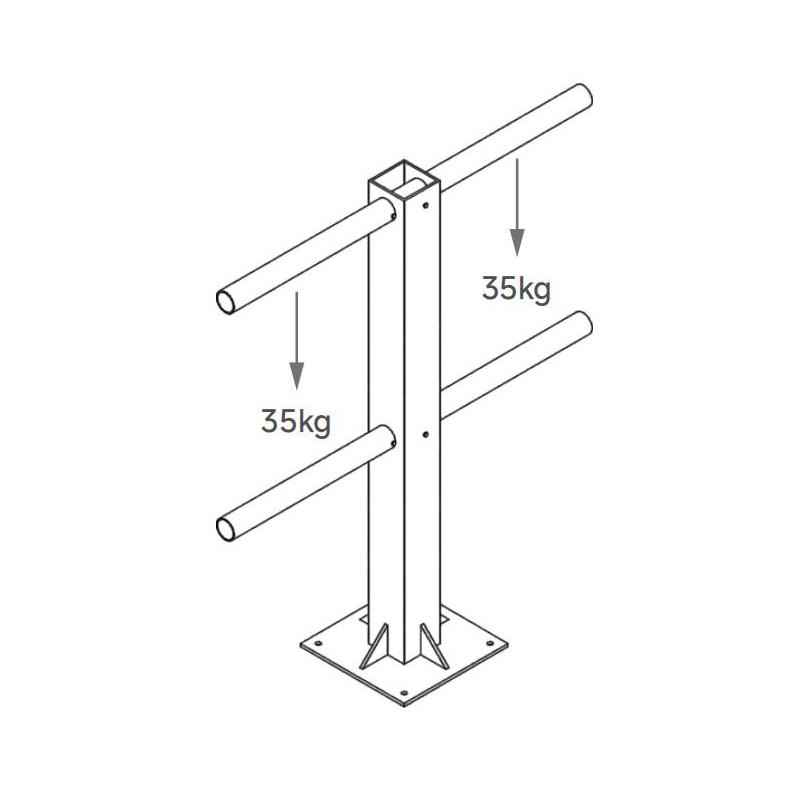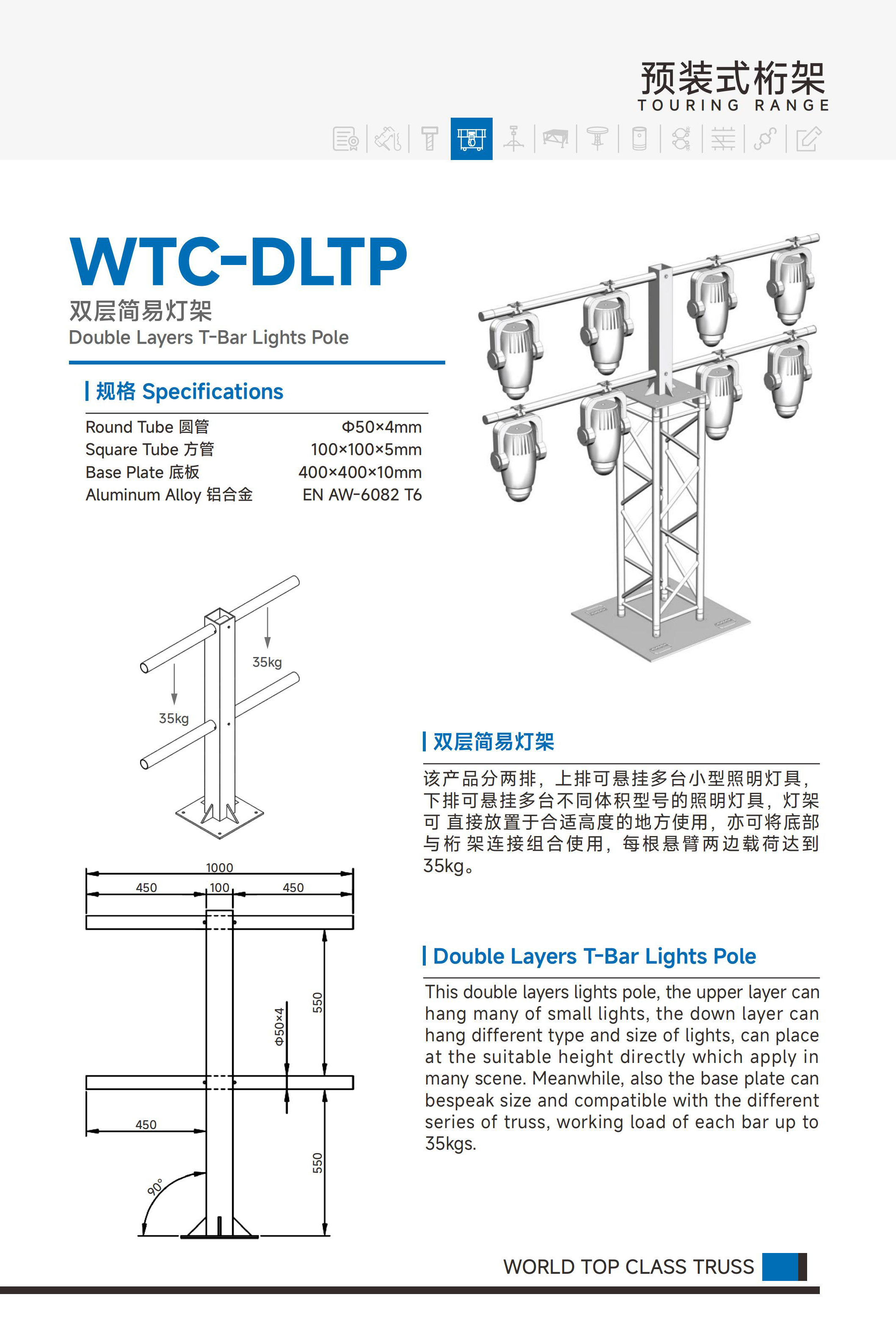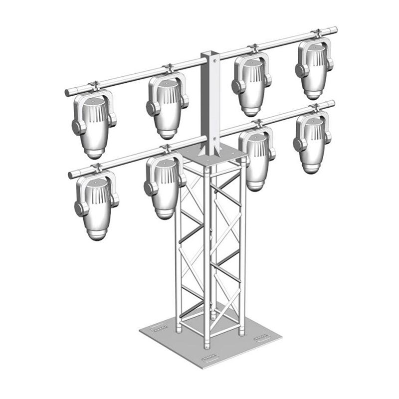 该产品分两排,上排可悬挂多台小型照明灯具,下排可悬挂多台不同体积型号的照明灯具,灯架可 直接放置于合适高度的地方使用,亦可将底部与桁 架连接组合使用,每根悬臂两边载荷达到35kg。